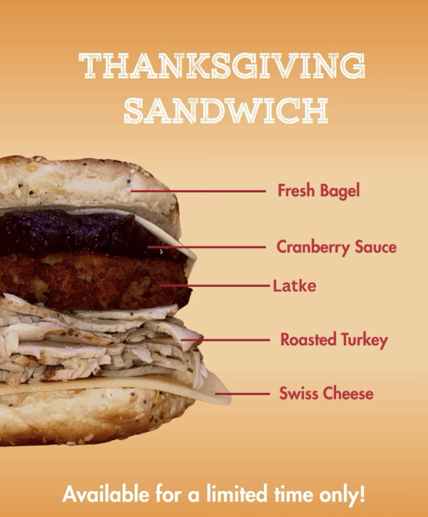 Thanksgiving is about more than just turkey and stuffing, it’s about gathering together, slowing down, and savoring the simple joys of the season. Whether you’re sharing a meal with loved ones, grabbing a bagel on the go, or picking up a sandwich to brighten your workday lunch, our goal is to give you a little taste of that togetherness with every bite. The Stuffing Bagel and the Thanksgiving Sandwich are made to be enjoyed with family, friends, or anyone who makes you feel at home.