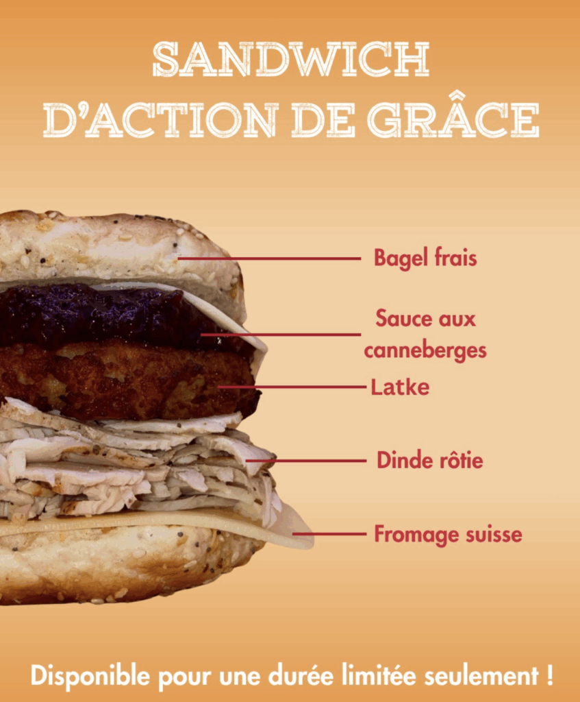 Bien sûr, nous ne pouvions pas laisser passer la saison sans ramener l’un de nos plats spéciaux les plus appréciés : le Sandwich de Thanksgiving. Garni de dinde rôtie, de fromage suisse, d’un latke croustillant et d’une généreuse couche de sauce aux canneberges, ce sandwich est le parfait mélange des saveurs des fêtes. Il est copieux, réconfortant et rempli des saveurs que vous attendez toute l’année. Pour beaucoup de nos clients, c’est devenu une tradition automnale, et nous sommes ravis de le revoir cette année.